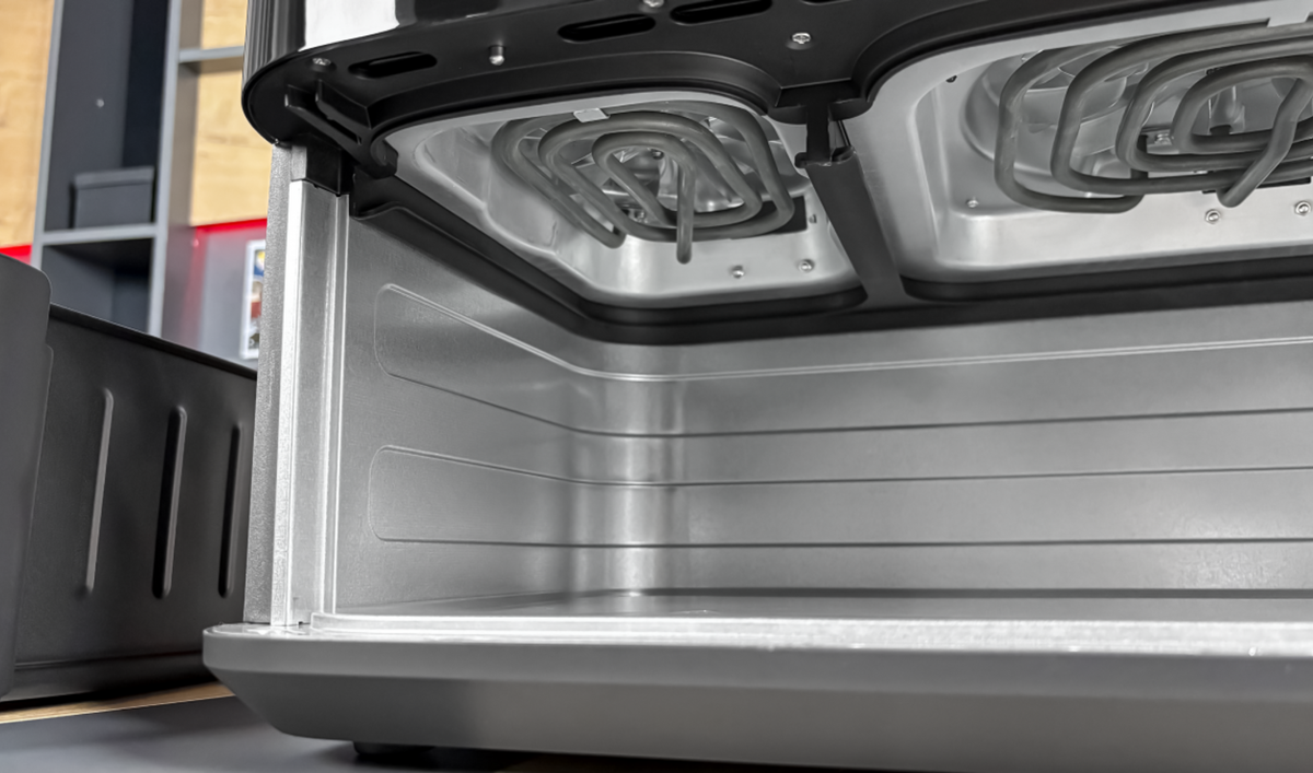 Главная особенность модели — две независимые зоны приготовления, которые позволяют одновременно готовить разные блюда с индивидуальными настройками температуры и времени. Это значительно экономит время и делает процесс готовки более гибким и удобным.