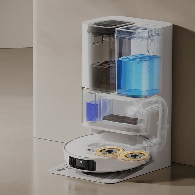 Предназначение станции: Автоматический забор мусора, заполнение контейнера водой, полоскание/сушка мопов